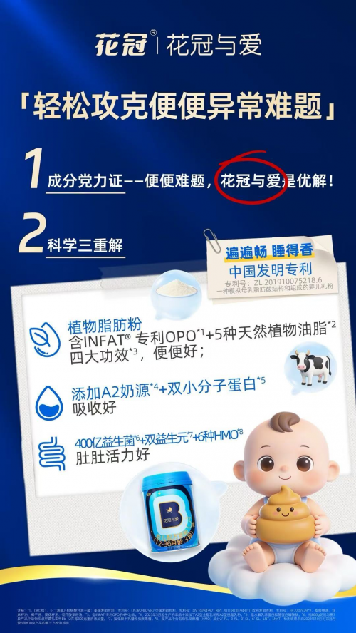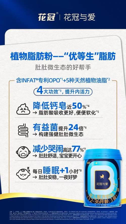以花冠与爱为例:植物脂肪粉,搭配高含量(400亿)益生菌【6】,提升宝宝的肚肚舒适度,改善便便和喂养体验。