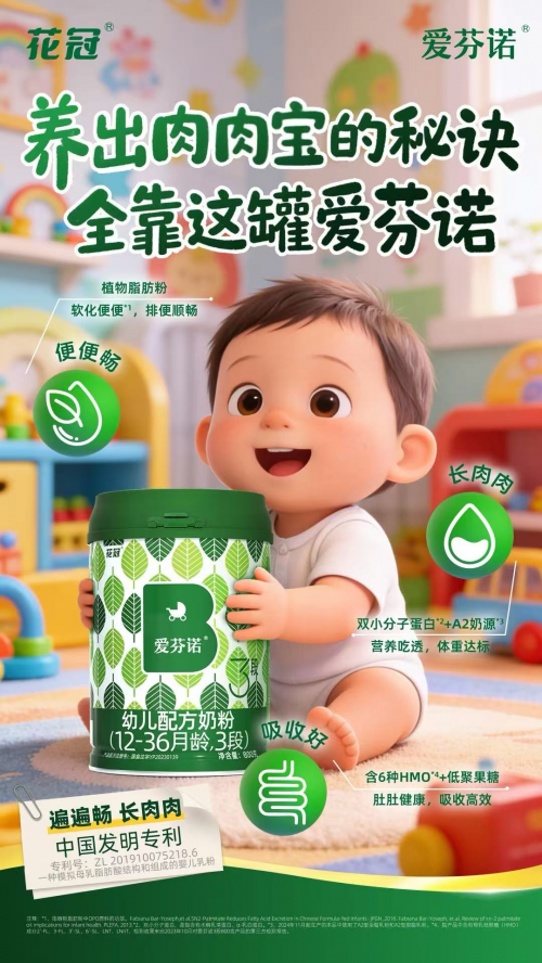 爱芬诺以植物脂肪粉,加上优质蛋白质(纯正A2奶源【7】、双小分子蛋白【8】)的强势组合,让宝宝吸收效率提升,更好地长肉肉。